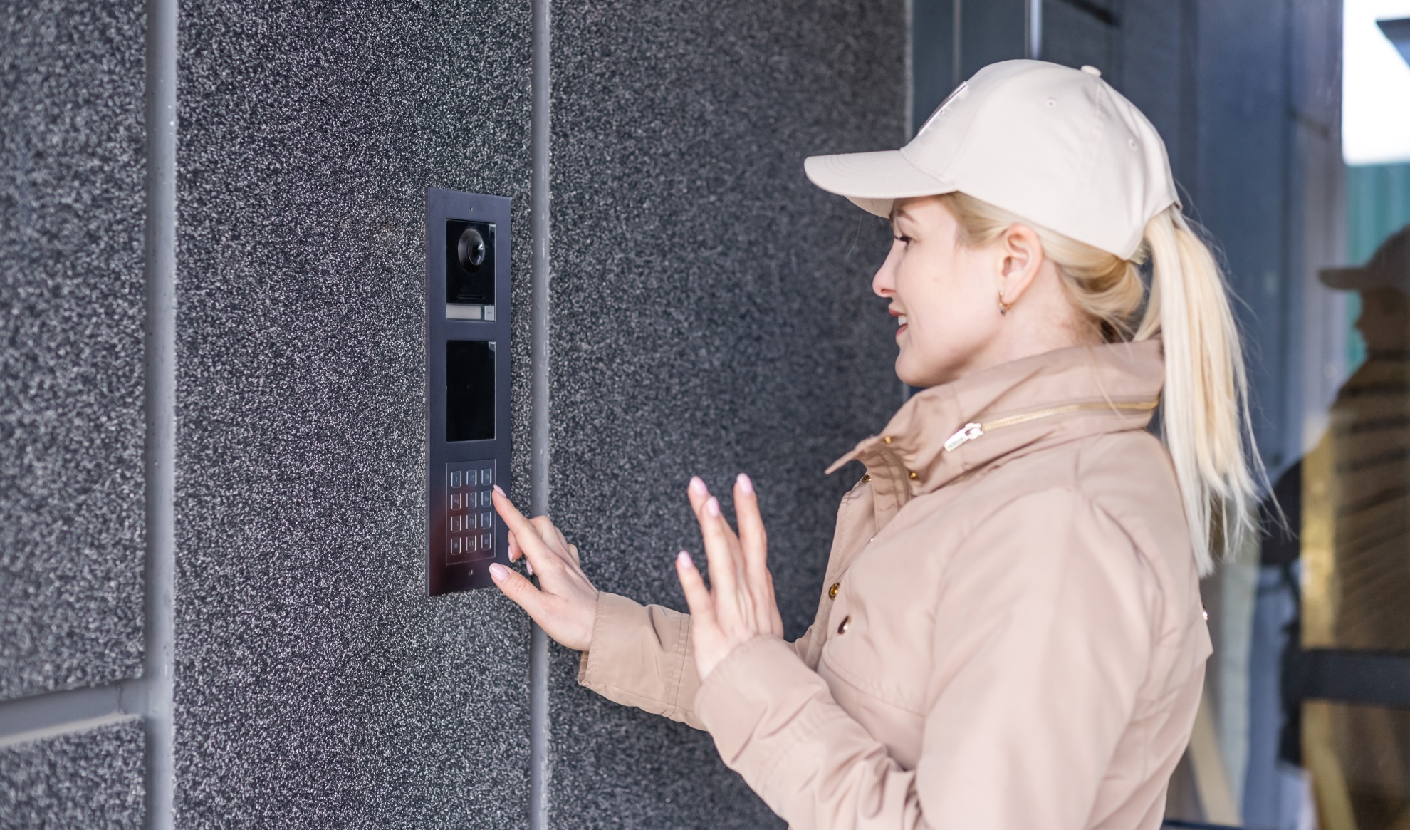 Close up the female hand presses the doorphone button The girl is calling the intercom Means of communication or notification of arrival and security of the entrance insideKimberly Ragucci2025-04-11T19:57:10+00:00